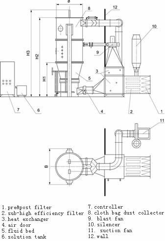 In spray drying / fluidized granulation in one, realize the liquid material by one step method particle. Using spray process, especially for micro materials, heat sensitive materials, efficacy than FL boiling granulating machine is 1 to 2 times higher. Final product water is up to 0.1%, with return powder device, granulation rate is more than or equal to 95%, of 0.2mm particles. Design improvements in mixed fluid atomizer, deal with concrete proportion of 1.3g/cm3.